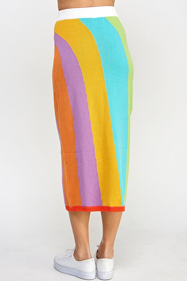 Our Colorwave Stripe Knit Set is a bold two-piece designed to bring color and confidence to your everyday wardrobe. Featuring a vibrant striped knit top paired with a matching midi skirt, this set delivers retro-inspired style with a modern, flattering fit.