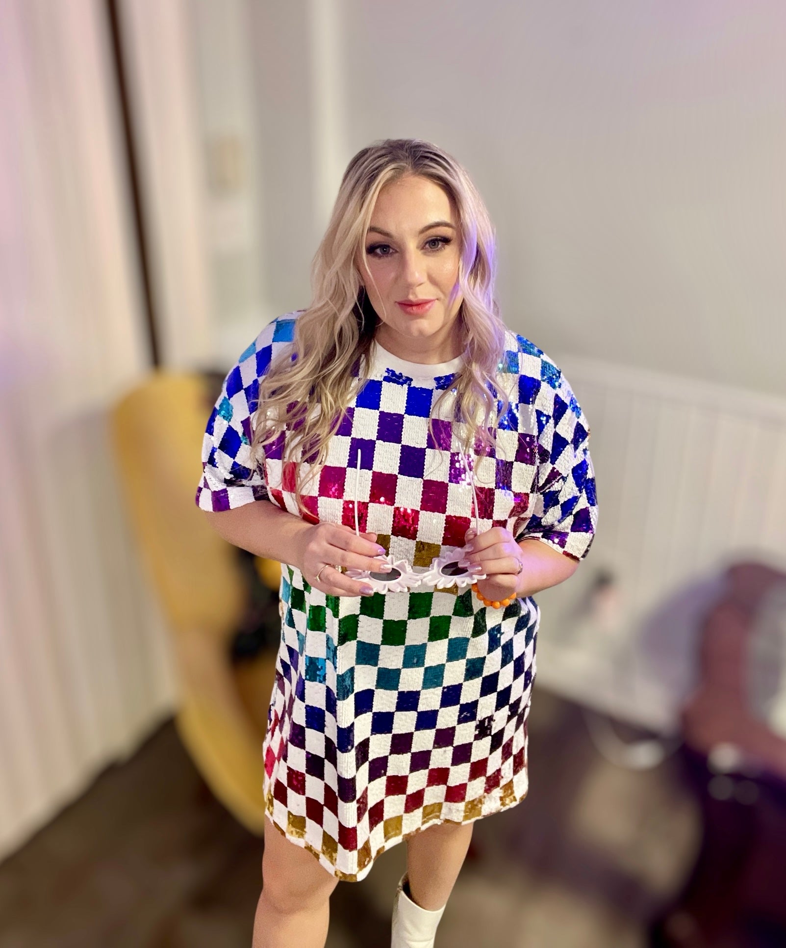 This rainbow checkered sequin mini dress is a bold statement piece designed to make you stand out! Featuring an allover checkerboard pattern in vibrant, multicolor sequins on a smooth base, our Electric Daydream Rainbow Sequin Dress brings together 70s disco glamour and playful retro energy in an easy-to-wear, relaxed silhouette.