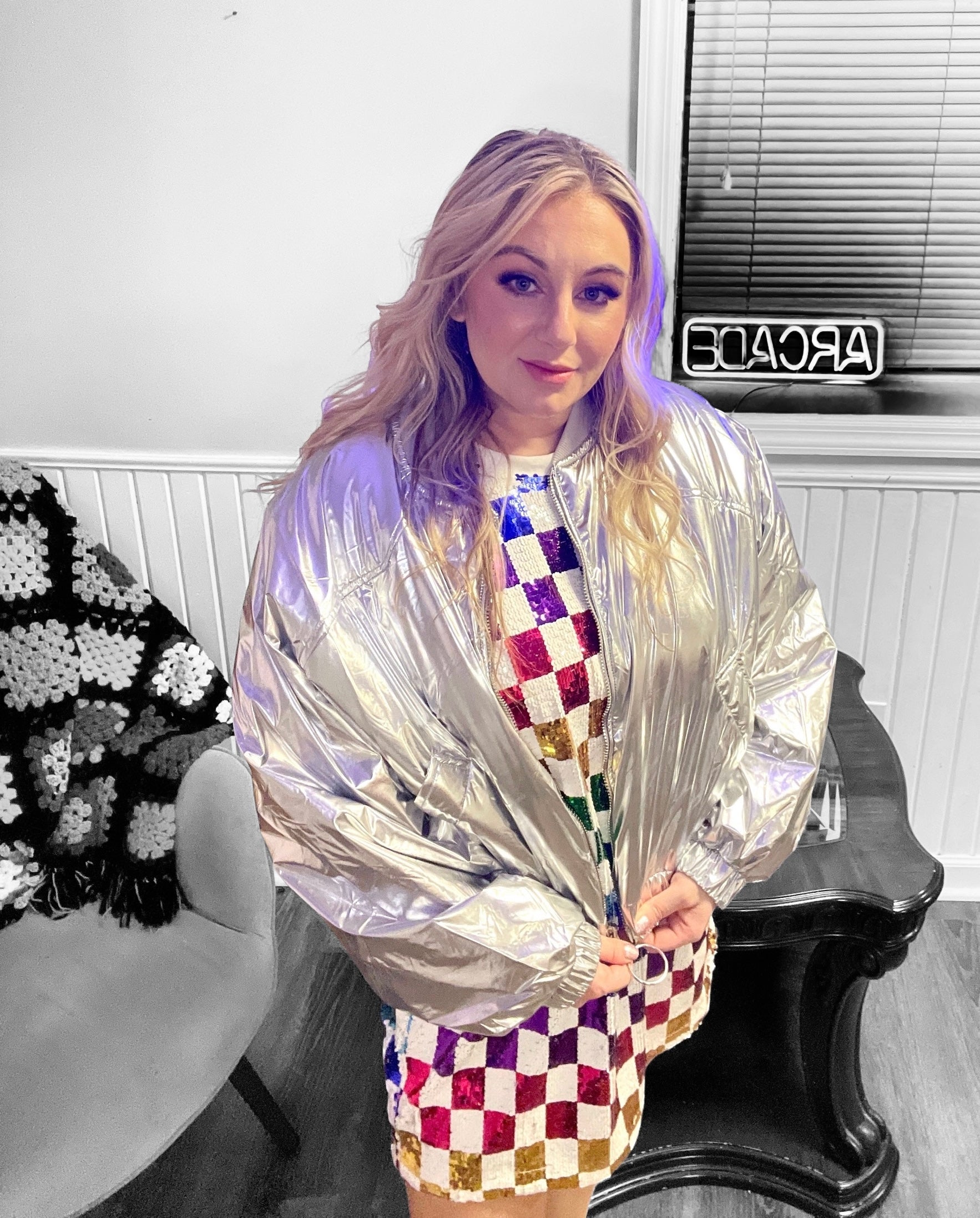 Designed with a loose, slightly boxy fit and fully lined for comfort, this dress transitions beautifully from winter layers to spring nights out. Style it with boots and a jacket now or pair it with heels and bold accessories later, the eye-catching sparkle and nostalgic pattern make it a standout piece you’ll reach for well beyond this season.