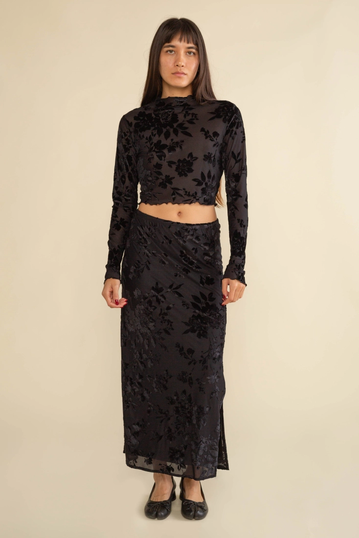 Step into the darkly romantic vibes of our Gothic Garden Velvet Skirt and Crop Top Set! This chic two-piece features a long-sleeve cropped top with a high neckline, paired with a matching fitted-yet-flowy midi skirt in sheer mesh velvet adorned with a moody black floral pattern. The skirt’s side slit adds a subtle touch of drama and movement. Wear the set together for a bold, statement-making look or mix and match each piece with your wardrobe to create countless fashion-forward outfits. Perfect for a night out, a stylish event, or any occasion where you want to turn heads. 🌹✨