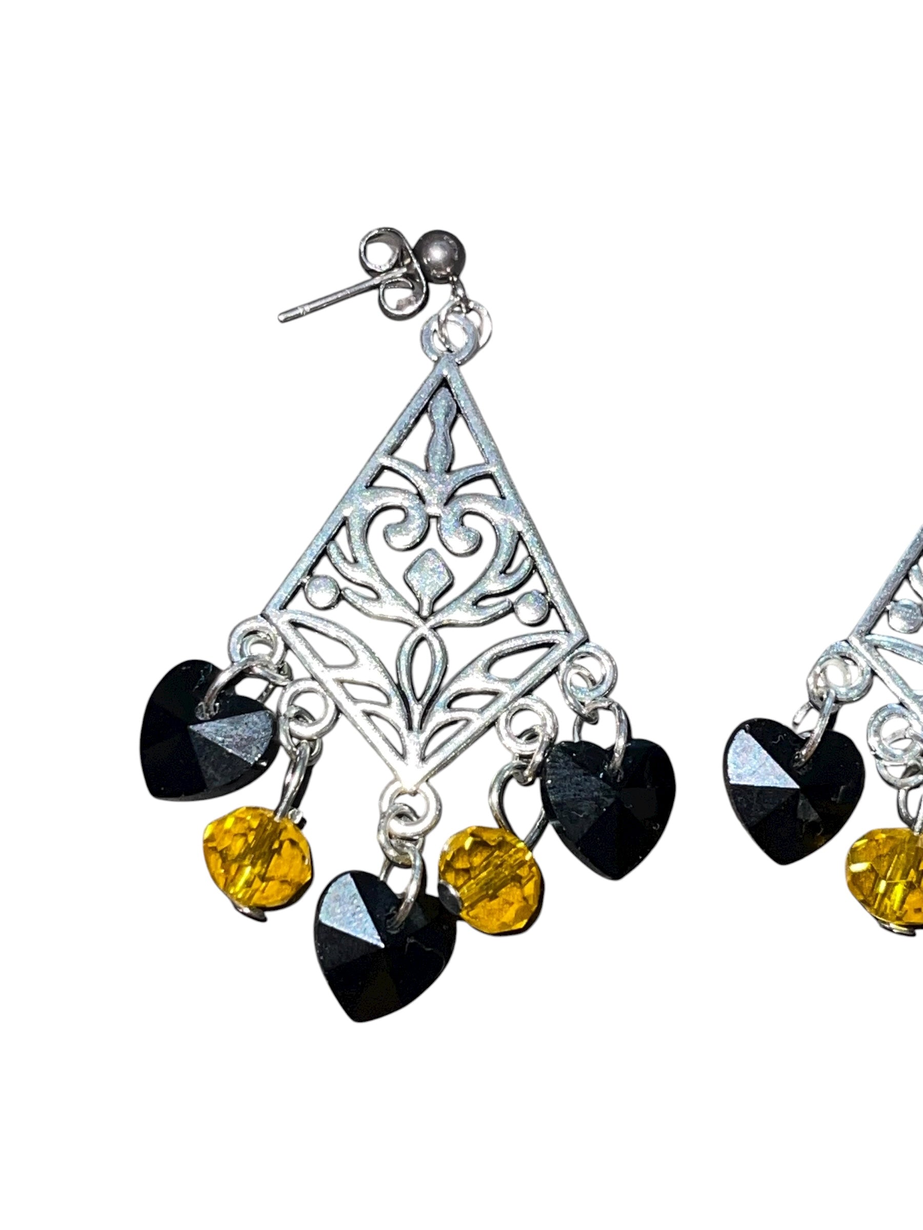 A bold twist on classic Pittsburgh style. The Hazy Daisy Steel City Hearts Earrings feature silver filigree details with dangling black heart and gold crystal charms, blending feminine elegance with black-and-gold pride. Lightweight yet statement-making, they’re perfect for showing your Steel City spirit at games, holiday parties, or nights out downtown.