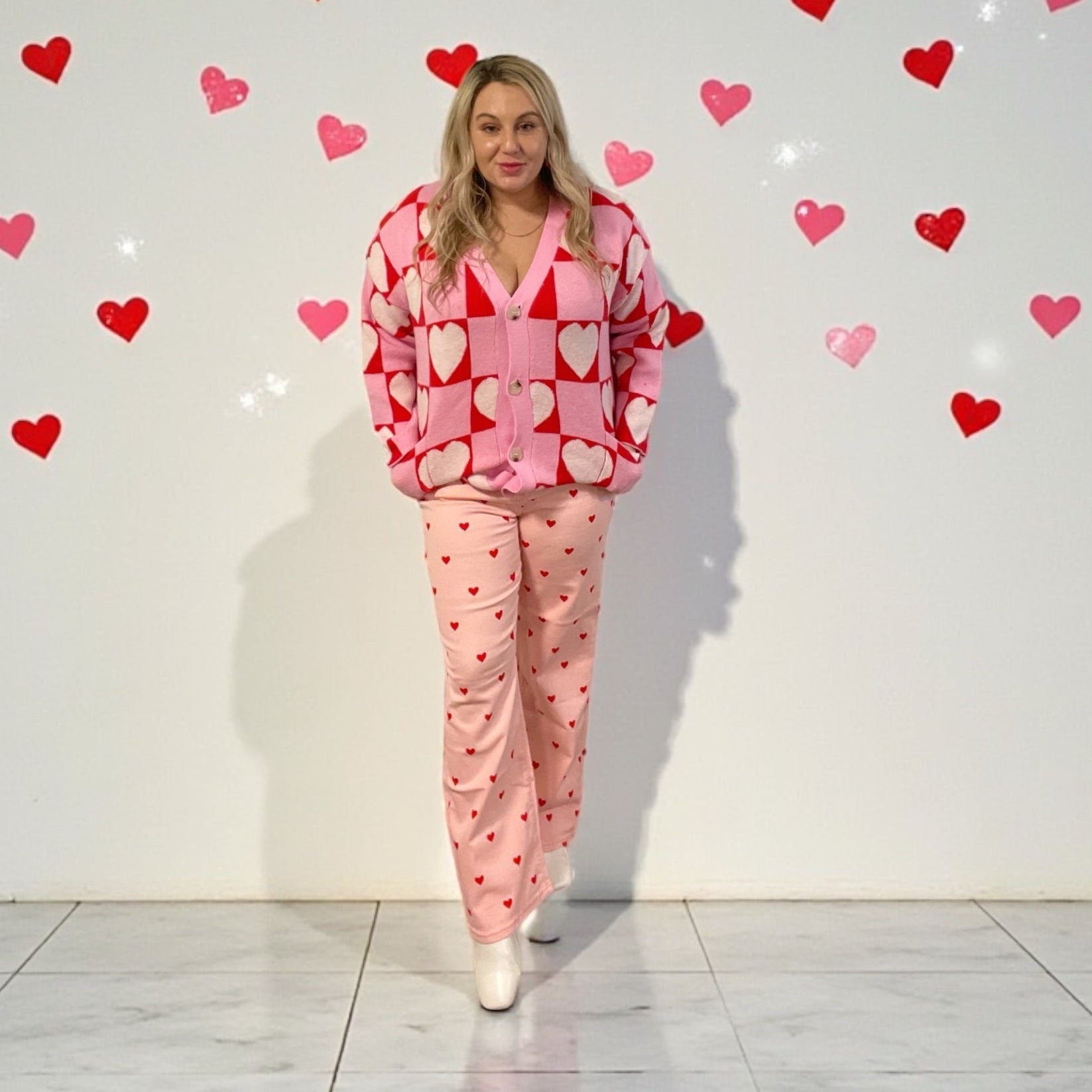 These pink heart print straight-leg pants are a bold yet wearable statement designed to stand out while still feeling effortless. Featuring a slim, flattering fit with an allover red heart print, they bring playful Valentine’s charm with a cool, fashion-forward edge.