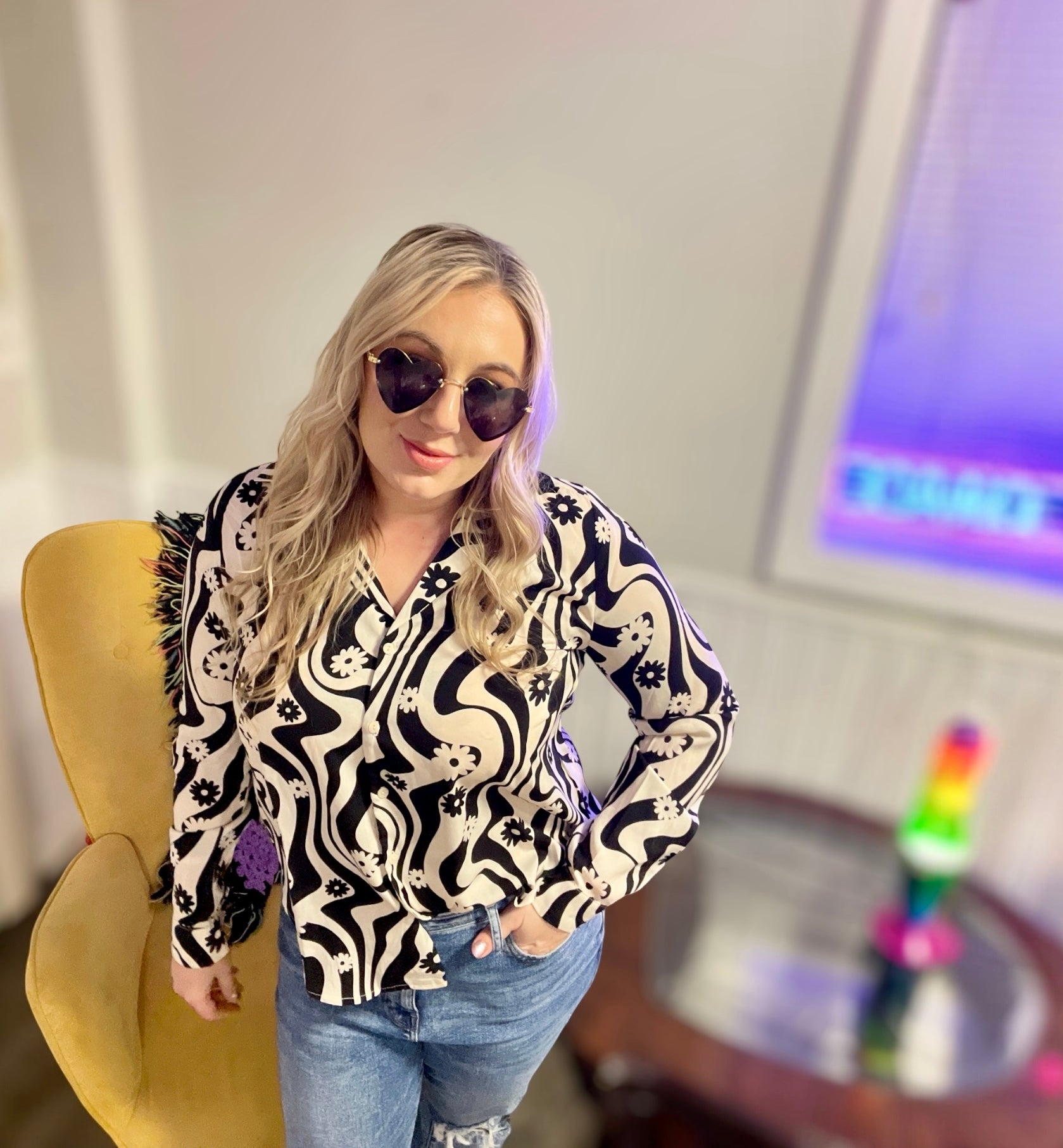 This black and cream swirl print blouse delivers bold 70's attitude with a playful twist. Featuring a striking retro wave pattern with daisy accents and a classic button-up silhouette, our It's Not Always Black and White Blouse blends graphic contrast with vintage-inspired charm in a lightweight, easy-to-style shape.
