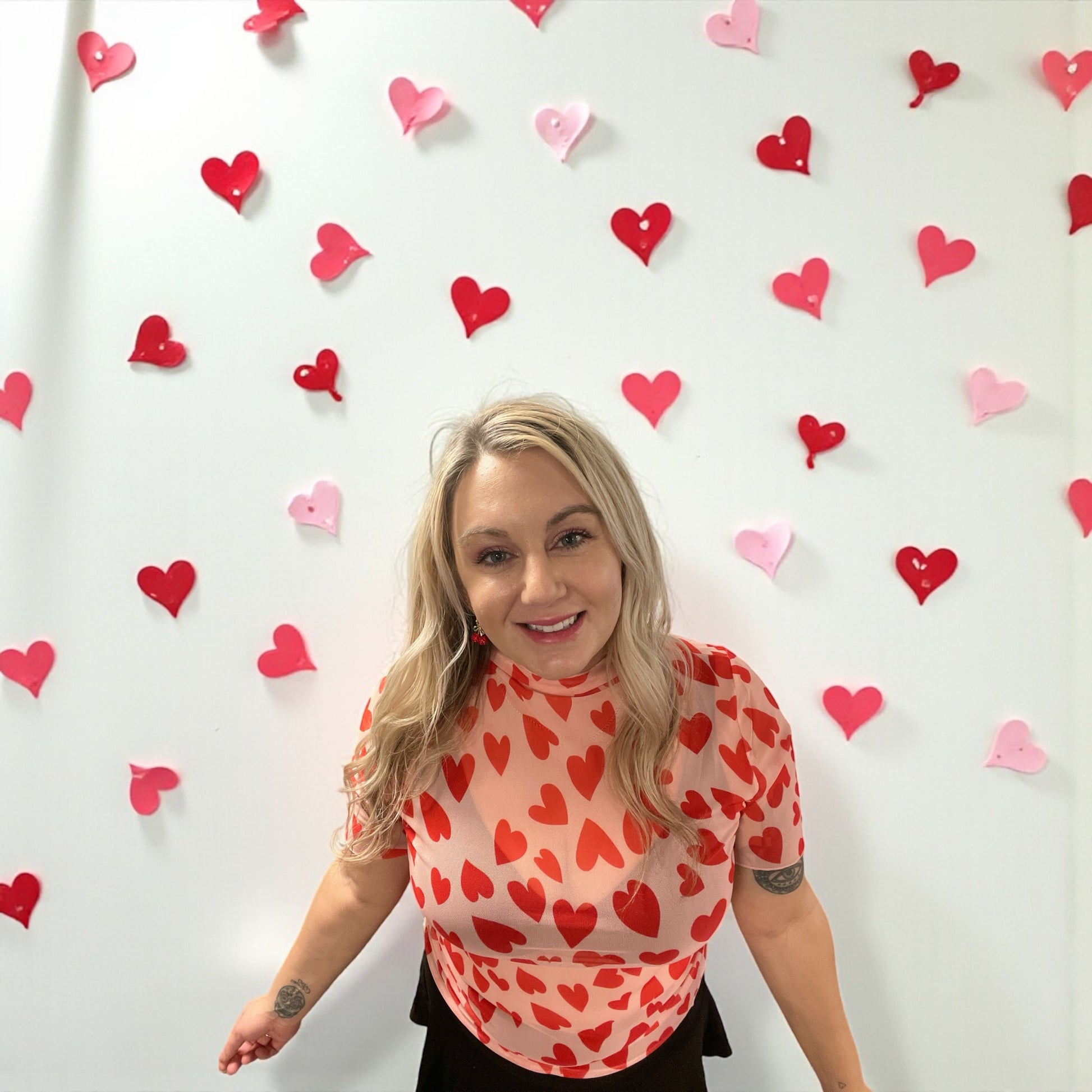 This pink heart mesh top is a flirty layering essential designed to add a playful pop to any outfit. Featuring an allover red heart print with a sheer, lightweight feel, it creates a fitted silhouette that’s perfect for styling under jackets, cardigans, or wearing on its own for a bold yet effortless look.